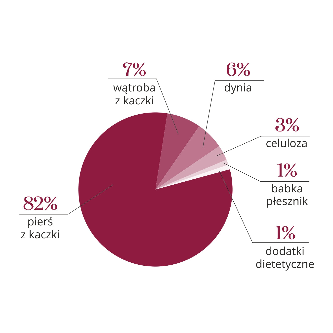 Mięso z piersi kaczki 82%, wątróbka kacza 7%, dynia 6%, celuloza 3%, babka płesznik 1%, witaminy i minerały, FOS 0,1%, tauryna 1300 mg/kg, naturalny ekstrakt z rozmarynu.