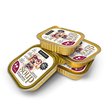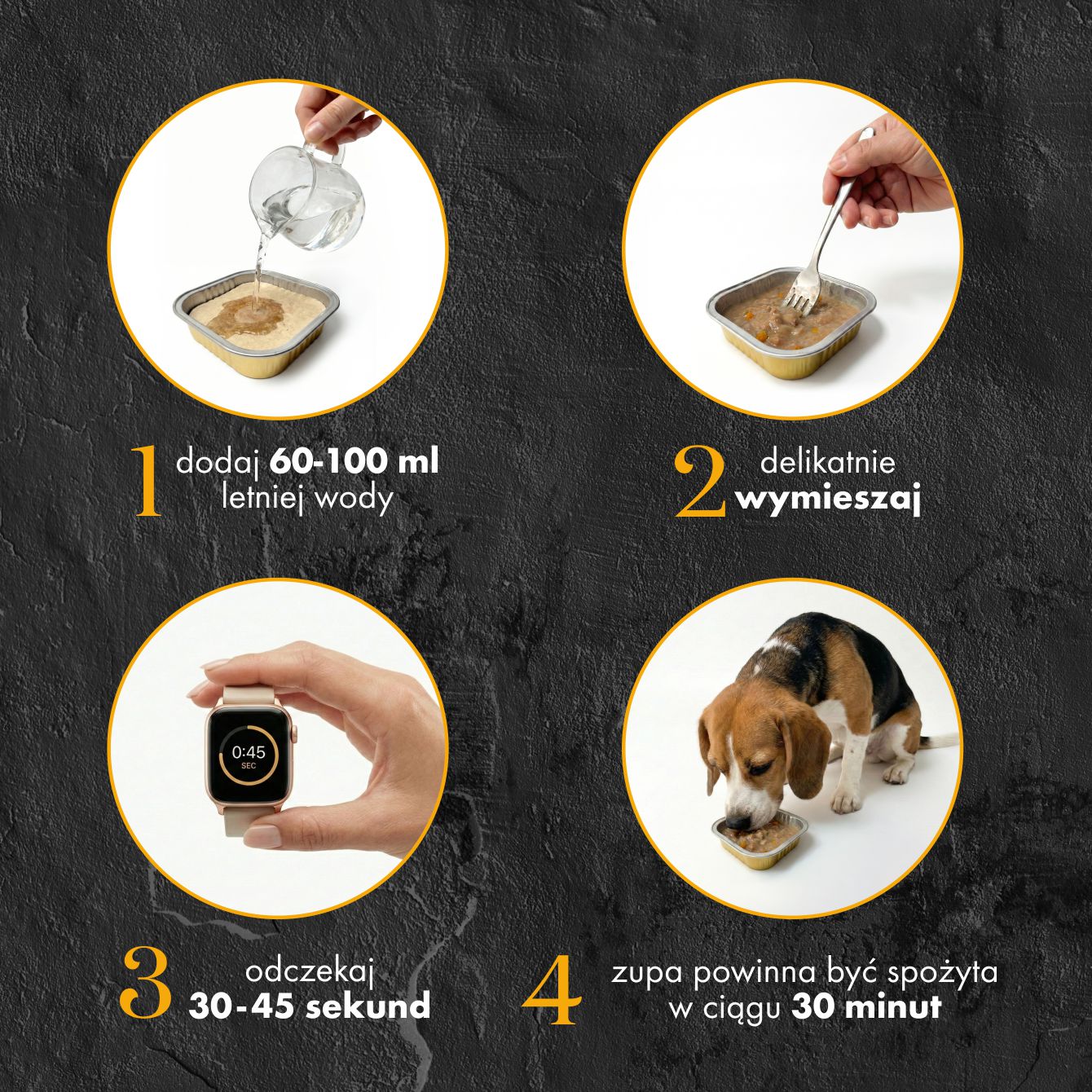 Forma zupy wspiera również nawodnienie organizmu.Dodanie wody przed podaniem zwiększa ilość płynów w diecie, co jest szczególnie korzystne u psów aktywnych, starszych lub mających obniżony apetyt. To pełnoporcjowa karma, która może stanowić podstawę codziennego żywienia lub jego wartościowe urozmaicenie.