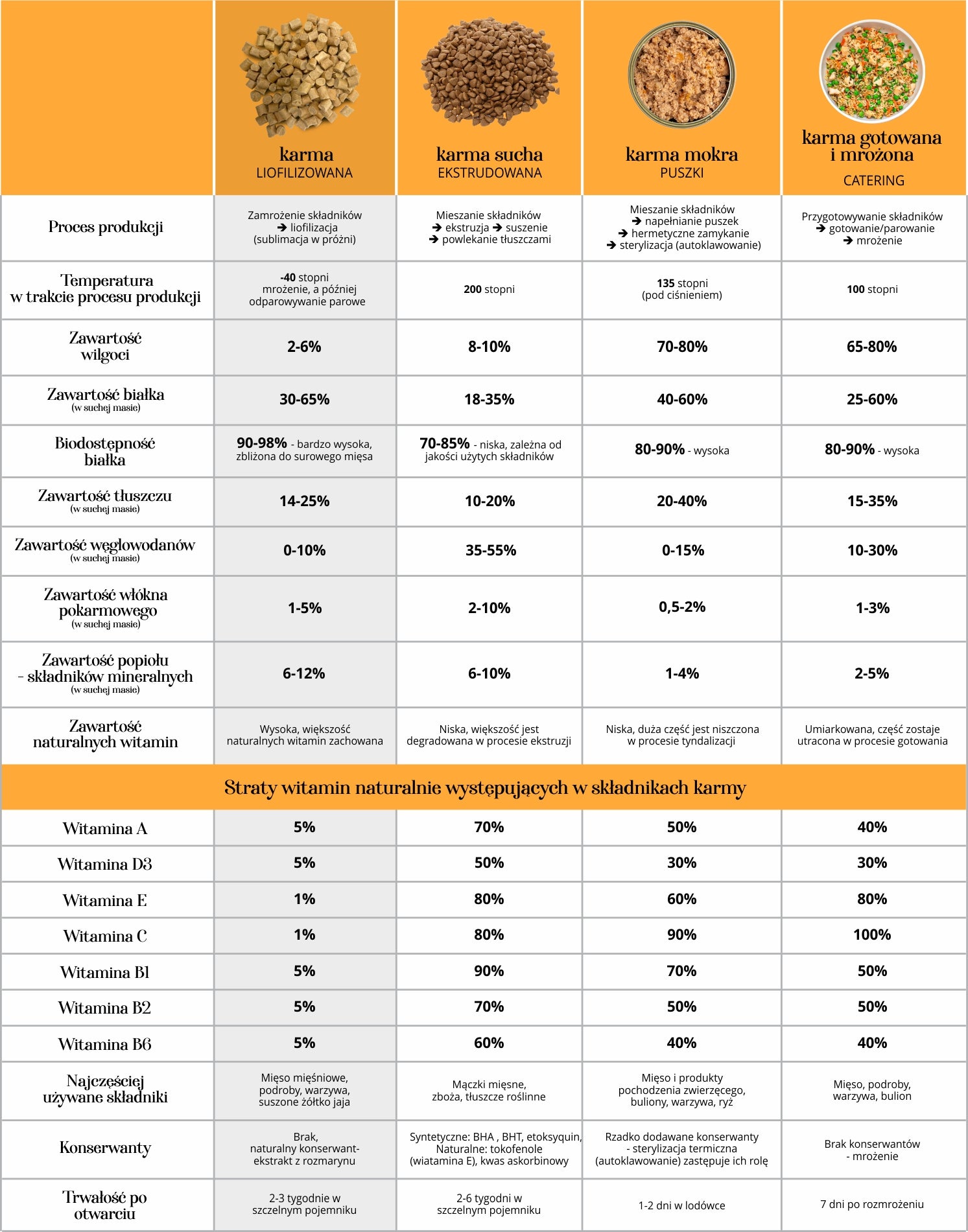 Hühnerfleisch – 70 %, getrockneter Kürbis – 10 %, Hühnerherzen – 8 %, Hühnerleber – 8 %, getrocknetes Eigelb – 2 %, Leinsamen – 2 %, Fischöl, Vitamine, Mineralien