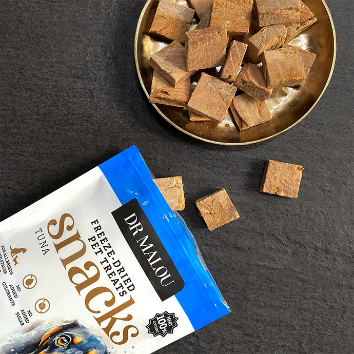 All dies macht die gefriergetrockneten Thunfischfleischwürfel von Dr. Malou für Hunde nicht nur zu einer leckeren Belohnung , sondern auch zu einem wertvollen Bestandteil der täglichen Ernährung .