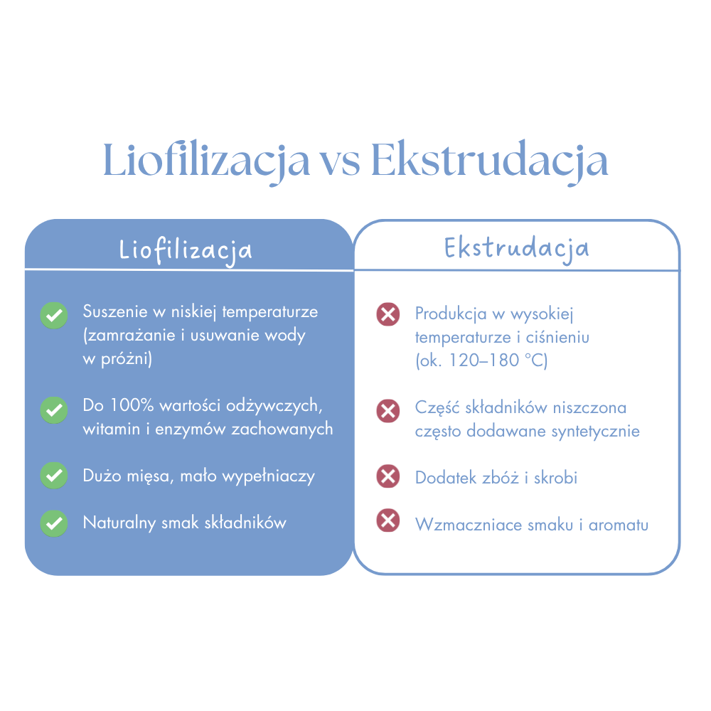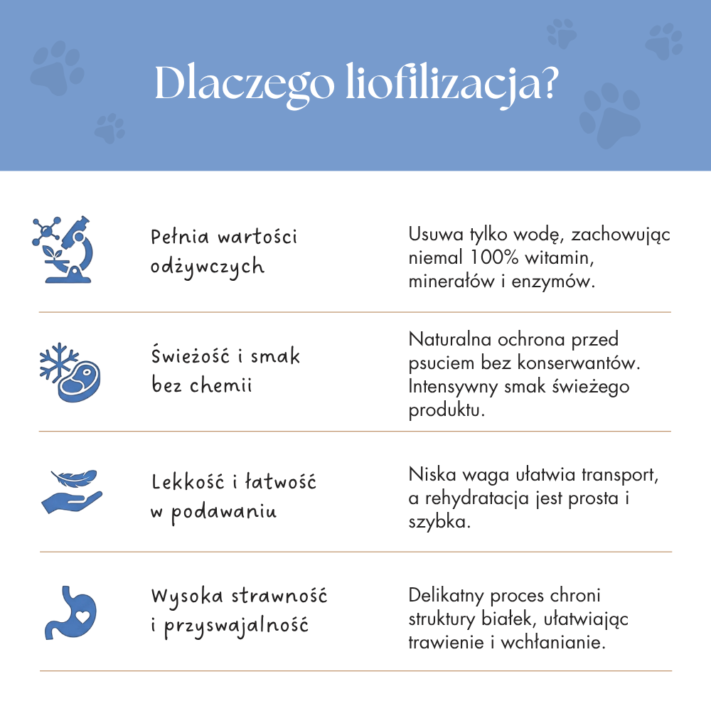 Poprzez proces liofilizacji karma Dr Malou zachowuje pełnię wartości odżywczych, świeżość i naturalny aromat – bez potrzeby stosowania konserwantów, zbóż i sztucznych dodatków.